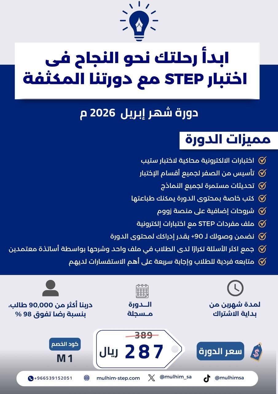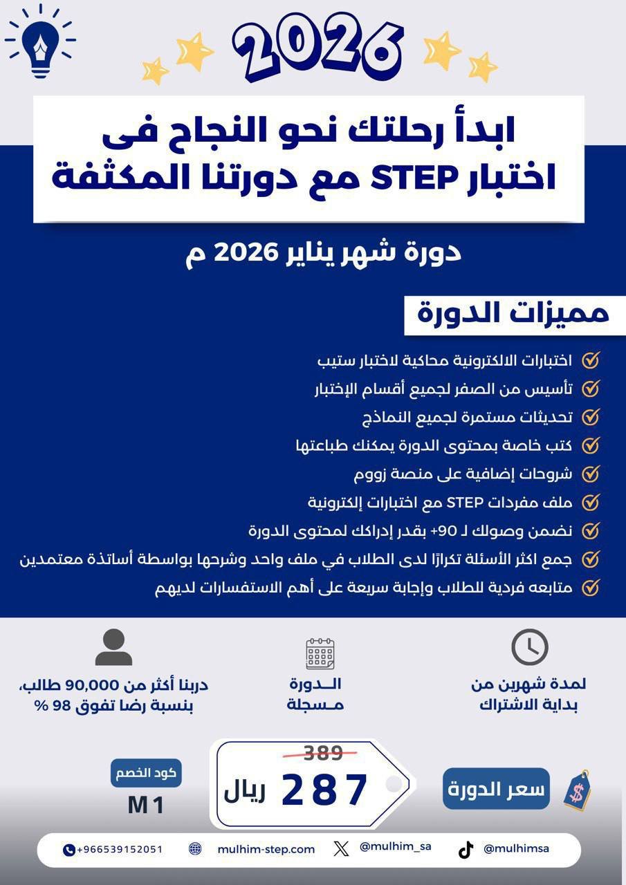 نحن نقدم لكم أفضل دورة ستيب STEP علي الإطلاق، والتي تساعدك علي تحقيق + 90 من أول مرة، وتلك الدورة تتميز بما يلي:-